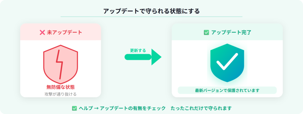 - 確認→アップデートの実施が最も確実な対策です。数分で完了します